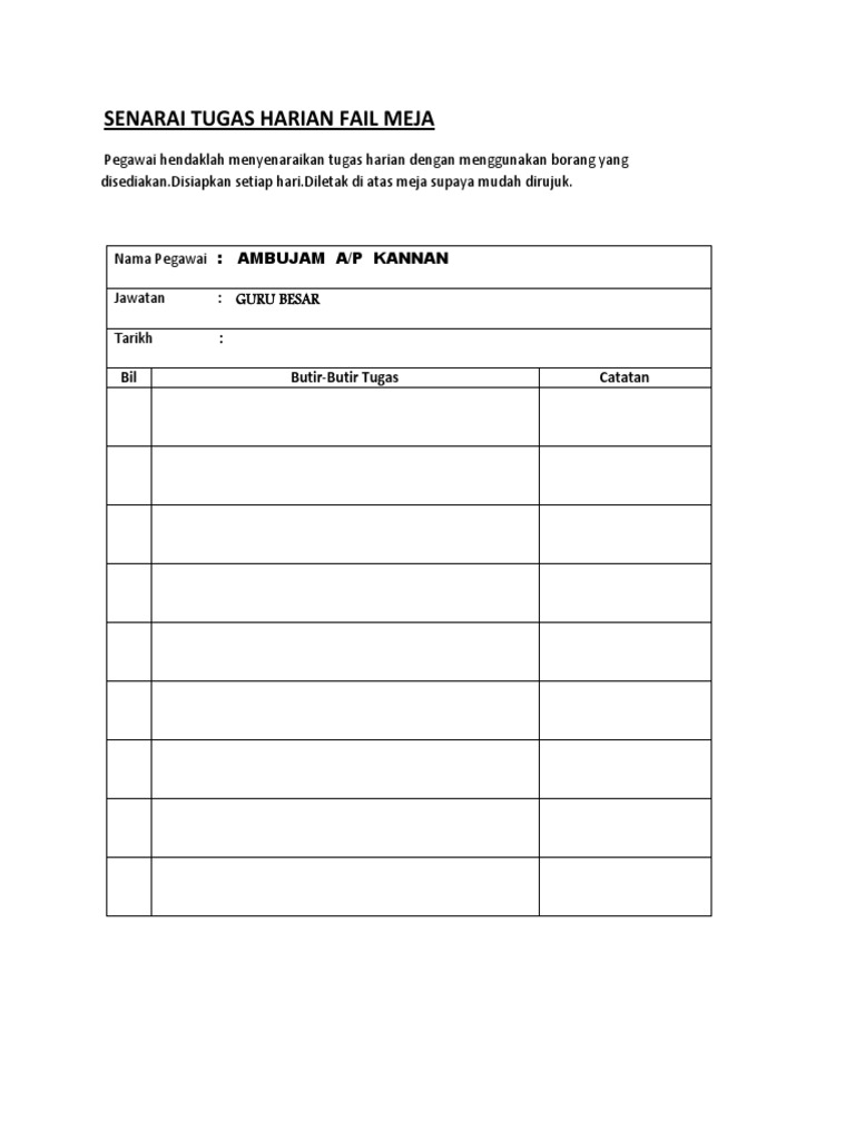 10Mengatur menyusun dan mengemas kini pejabat bilik Penolong Kanan dan Guru Besar. SEKOLAH MENENGAH TEKNIK JASIN BORANG AGIHAN TUGAS GURU PANITIA Edisi Tahun 2013 Dokumen Ini Perlu Disediakan Pada Salinan Berikut. 0 penilaian 0 menganggap dokumen ini bermanfaat 0 suara 50 tayangan 7 halaman.